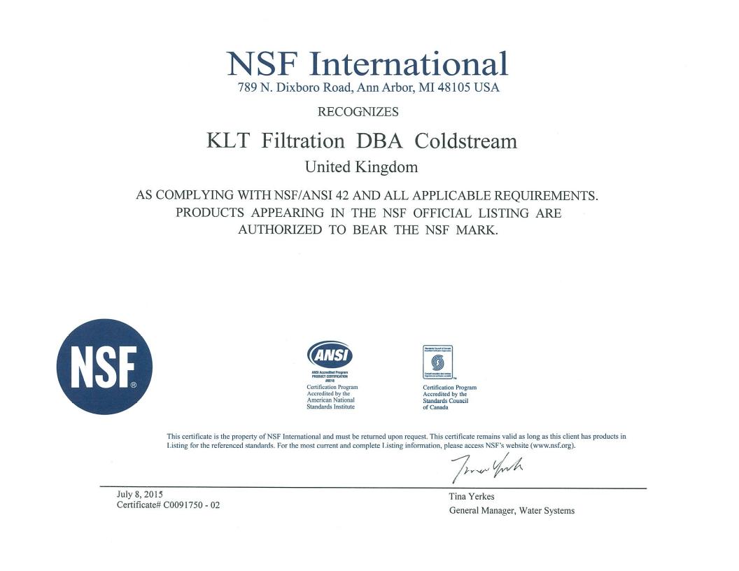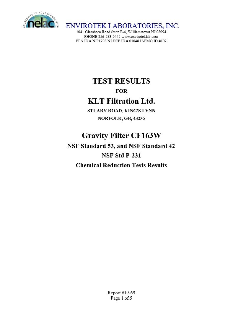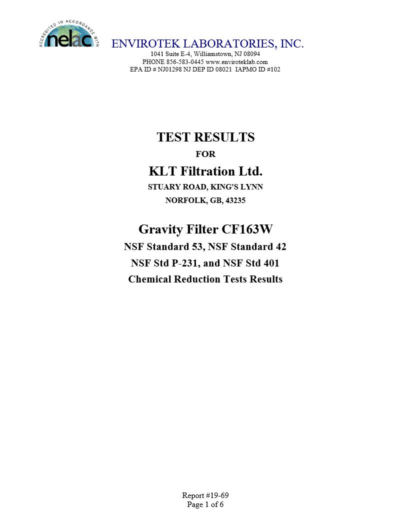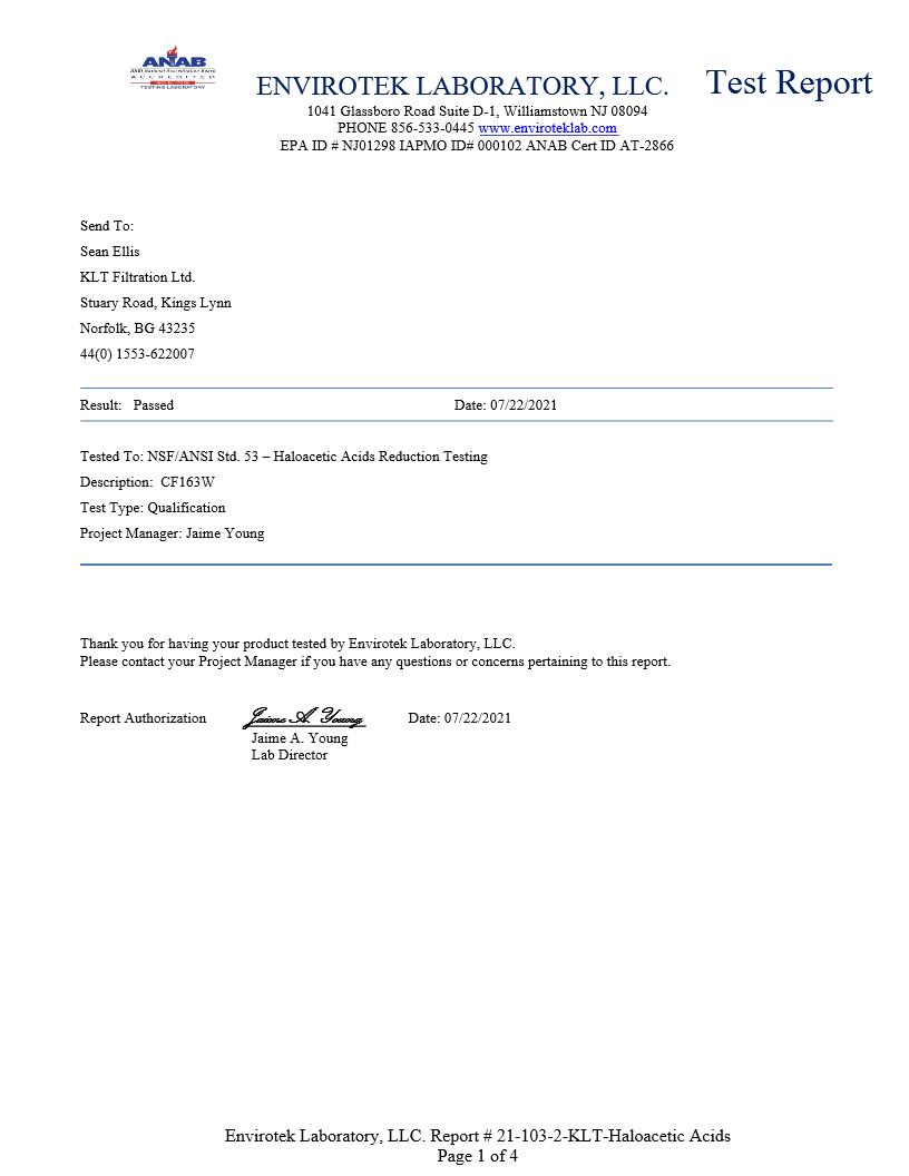 De tests worden uitgevoerd volgens de NSF/ANSI-normen 42, 53 en P231 door Envirotek Inc, New Jersey, VS, EPA-ID # NJ01298 NJ.